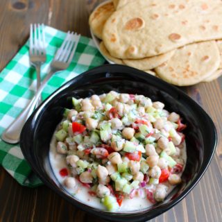 Notes about this recipe: the vegetables release some water once they're salted, but if you let the salad sit overnight, most of the water is absorbed by the chickpeas. If you want a thicker salad, be sure to use Greek yogurt, and feel free to place the chopped cucumbers on paper towels, salt them, and let the rest for 10 minutes. Blot up the released water and continue with the recipe.